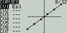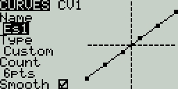 The Curves screen allows you to define custom curves to use in the Inputs, Mixes, or Output screens. The curves screen will show the configured custom curves, with a graphical representation of each curve.