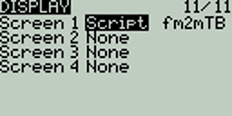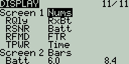 The Display screen is where you configure the telemetry screens shown when pressing the [Tele] button from the main screen.
