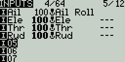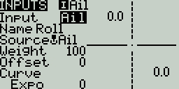 Weight - Percentage value of the stick travel to use (often referred to as "rates"). You can also long press [Enter] to bring up a menu that will let you change this to be based on another input, axis, pot, MAX (always returns 100), MIN (always returns -100), cyclic, trim switches, channel values, global variables and more.