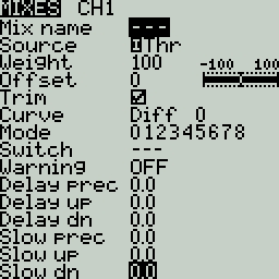 Weight- Percentage of the source value to use. In addition to physical controls, you can also specify MAX (always returns 100), MIN (always returns -100), cyclic, trim switches, channel values, global variables and more. Moving the physical control after the source has been selected will automatically map it to that input. Long press [Enter] to bring up the list of available source categories.