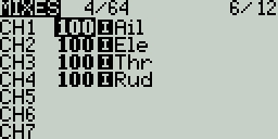 The Mixes screen is where several Inputs can be combined into one "Channel Mix". These mixes are then assigned to a radio channel for output. This is also the place where switches, knobs or sliders are assigned to a channel for output. Similar to the Input section, it is also possible to assign a weight, offset or curve to a channel mix.