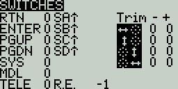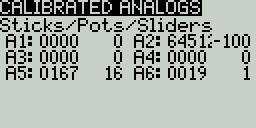Debug Analogs - These screens will show you the data for your analog controls (Sticks, Sliders, Pots, 6-position switch). There are two views - Calibrated Analogs, Raw Analogs (5 Hz).