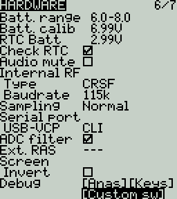 The Hardware screen is where you configure hardware specific-settings for your radio. It shows all physical hardware objects (sticks, pots, switches) and allows for their modifications. It is also where you can calibrate your sticks and pots. It also contains additional configuration options.
