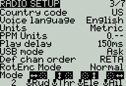 Def Chan Ord - The default channel order for new models and the trainer screen. The letters stand for: A = Aileron, E = Elevator, T = Throttle, R = Rudder. Changing this setting does not affect existing models. On Surface Radios, the letters stand for S=Steering, T=Throttle.