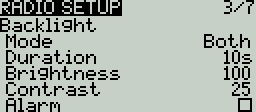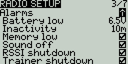 Power Auto Off - If enabled (not enabled by default), if the handset is left inactive, with no trainer or telemetry link active, it will automatically turn off after the configured duration. You can select from 0 (disabled) up to 255 (minutes).