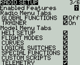 The Enabled Features section of Radio Setup allows you to configure the Global settings for which tabs are visible in the Radio Setup and Model Settings area of EdgeTX. The configuration setting for the active model will show to the right of the checkbox. The model configuration will override the global configuration (which will be indicated by the "Off" and "On" shown next to any model level overrides).