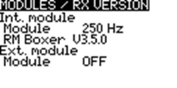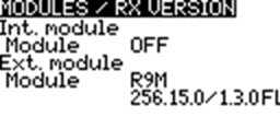 To view the Modules / RX Version information about the activated RX modules for the currently selected model, highlight the [Modules / RX Version] option and press the [Enter] button.