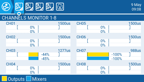 The Channel Monitor shows both the output value (top bar) and mix value (bottom bar) for each of the 32 radio channels, spread across 4 pages of 8. &#x20;