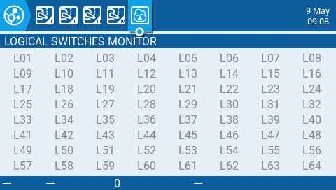 The 5th page of the channel monitor is the logical switches monitor. On this page, you will see the status (activated/non-activated) of all logical switches. Logical switches that are activated are highlighted.&#x20;