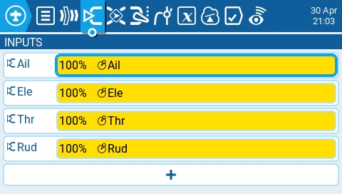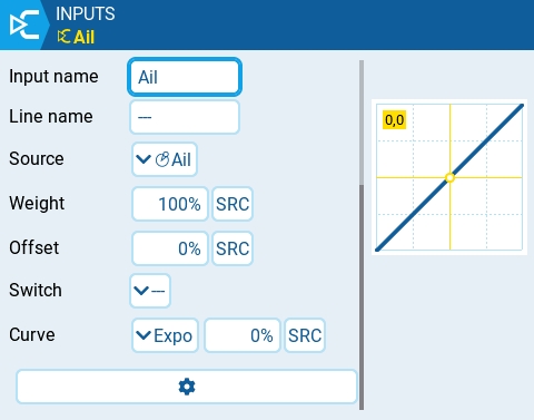The Inputs screen of Model Settings is where you map your physical radio controls (for example: sticks, sliders, and pots) to a software input to be used by the radio. After the control has been mapped it is then possible to apply modifiers to the inputs such as a weight, offset or curve which will then be applied anywhere that input is used. Although it is possible to also assign switches as inputs, it is normally not needed as switch outputs seldomly need to be modified by a weight, offset or curve. By default, EdgeTX will automatically map your contoller sticks to Aileron, Elevator, Throttle, Rudder based on the default channel order defined in Radio Setup.