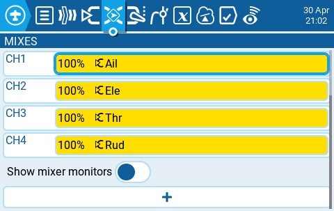 The Mixes screen of Model Settings is where several Inputs can be combined into one "Channel Mix". These mixes are then assigned to a radio channel for output. This is also the place where switches, knobs or sliders are assigned to a channel for output. Similar to the Input section, it is also possible to assign a weight, offset or curve to a channel mix.