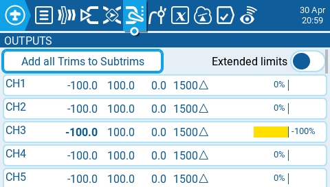 The Outputs screen of Model Settings is where final adjustments to the control data are made (including subtrims, curves, endpoint, and center values) before finally sending the control data to the RF module. This is where the channel center, limits (to prevent servo binding) and output direction are set.