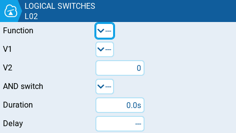 <table><thead><tr><th width="137">Expression</th><th width="606">Description</th></tr></thead><tbody><tr><td>a=x</td><td>True when the source V1 is exactly the same as the constant V2.</td></tr><tr><td>a~x</td><td>True when the source V1 is about the same as the constant V2.</td></tr><tr><td>a>x</td><td>True when the source  V1 is greater than the constant V2.</td></tr><tr><td>a&#x3C;x</td><td>True when the source  V1 is less than the constant V2.</td></tr><tr><td>|a|>x</td><td>True when the absolute value of the source V1 is greater than the constant V2.</td></tr><tr><td>|a|&#x3C;x</td><td>True when the absolute value of the source V1 is less than the constant V2.</td></tr><tr><td>AND</td><td>True when both sources V1 and V2 are TRUE.</td></tr><tr><td>OR</td><td>True when either source V1 or V2 is TRUE.</td></tr><tr><td>XOR</td><td>True when the source V1 and V2 positions do not match.</td></tr><tr><td>Edge</td><td>Momentarily true when the source V1 has been active for the defined period of time and then deactivated. The first time field (T1) under V1 is the minimum active duration required for source V1 to activate the logical switch. The second time (T2) is the maximum time allowed for the source V1 to be active for the logic switch to be activated. When T2 is set to --, the logical switch will be true regardless of how long V1 has been active. When T2 is set to 3, if V1 is active for more than 3 seconds, the logical switch will not be set to true when the source is deactivated. When T2 is set to &#x3C;&#x3C;, the logical switch will be true when the time conditions in T1 are met without source V1 being deactivated.</td></tr><tr><td>a=b</td><td>True when source V1 is the same as source V2.</td></tr><tr><td>a>b</td><td>True if source V1 is greater than source V2.</td></tr><tr><td>a&#x3C;b</td><td>True if source V1 is less than source V2.</td></tr><tr><td>△>x</td><td>Momentarily true every time the source V1 changes by more than the amount indicated by the constant V2. </td></tr><tr><td>|△|>x</td><td>Momentarily true every time the absolute value of the source V1 changes by more than the amount indicated by the constant V2.</td></tr><tr><td>Timer</td><td>Momentarily true every xxx seconds. Argument V1 is the duration that the logical switch is true (active). Argument V2 is the time between logical switch activations. Repeats timer cycle as long as the defined switch is active.</td></tr><tr><td>Stky (Sticky)</td><td>"Sticks" true after switch V1 is active (true) and stays active (true) regardless of V1 position until switch V2 is activated (true) and "unsticks" or deactivates (false) the logical switch. Has Persistence option that allows the value of the logical switch to be preserved across power cycles or when switching away from and back to the model. </td></tr></tbody></table>