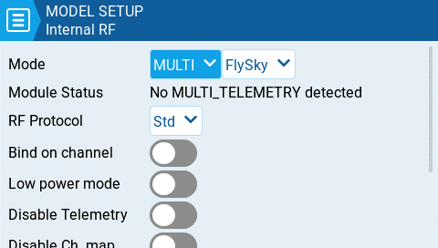 * **Multi** - Multiprotocol Module. The configuration options are unique to each selected protocol Configuration options for the multi-protocol module are described here:  <https://www.multi-module.org/using-the-module/protocol-options>