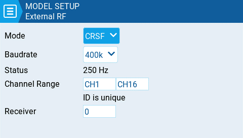 <div><figure><img src="https://content.gitbook.com/content/P2t2HC29IiiujobytzG7/blobs/i4sSSIZkMFfRaszCL8qs/internalrf.png" alt=""><figcaption><p>Internal RF with multi-protocol module selected</p></figcaption></figure> <figure><img src="https://content.gitbook.com/content/P2t2HC29IiiujobytzG7/blobs/puBz50ec1obG7hKIG03v/externalrf.png" alt=""><figcaption><p>External RF with CRSF selected</p></figcaption></figure></div>