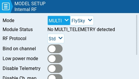 Multi - Multiprotocol Module. The configuration options are unique to each selected protocol Configuration options for the multi-protocol module are described here: https://www.multi-module.org/using-the-module/protocol-options
