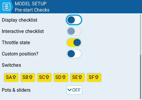 **Switches** - The section displays all the switches that are configured on the radio and allows you to select which position is the correct position for the switch state check. Selecting the switch will cycle through the available switch positions or turn the check off for the switch completely. Yellow switches have the switch position check activated. White switches are de-activated. A long press (or touch) of **\[Enter]** while this section is highlighted will set all the switch positions to the currently configured physical positions of the switches.
