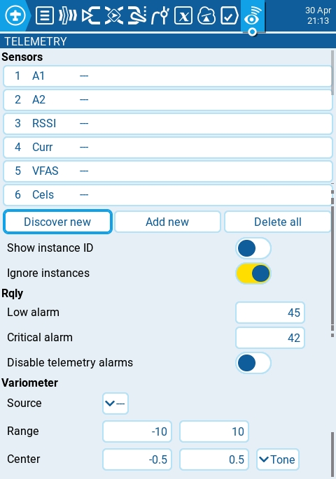 Telemetry is data received from the model to the radio from various sensors. These sensors may be in included in the radio receiver or flight controller, or may be separate sensors, such as GPS, variometer, or magnetometer. Telemetry data that is received can be displayed by EdgeTX in widgets, configured in alarms or audio call-outs.