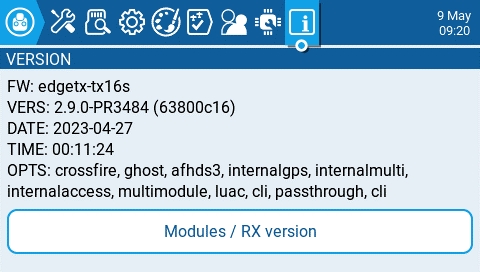 The Modules / RX Version gives you information about the activated RX modules for the currently selected model.
