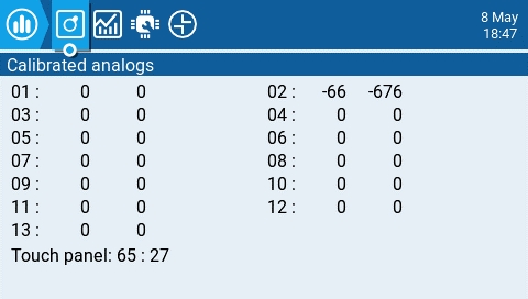 Analogs - These screens will show you the data for your analog controls (Sticks, Sliders, Pots, 6-position switch) and the touch screen on your radio. There are four views - Calibrated analog, Filtered Raw Analog with deviation, Unfiltered raw analog, and Min Max and range.