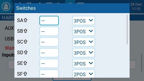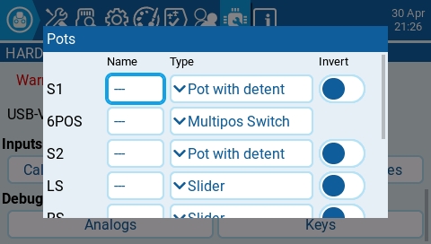 Selecting one of the Axis, Pots, or Switches buttons will open the configuration screen. On these screens, you will see all the physical radio controls pre-defined by EdgeTX. Here you can add a 3 character label to the control as well as change the type of control as needed. Addionally, controls listed under the Pots screen can also be configured to be inverted.