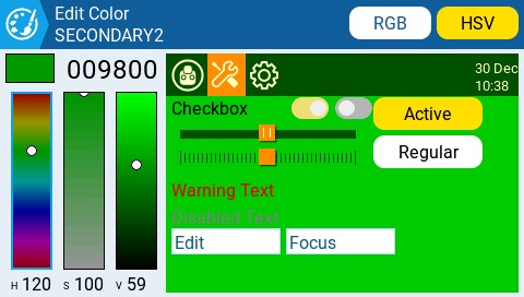 Select the color using either the color scales on the left side of the screen. You can choose between the RGB and HSV color scales with the buttons at the upper right side of the screen.&#x20;