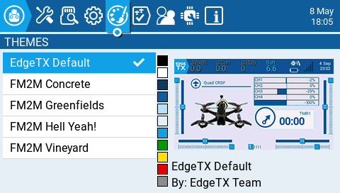 The **Theme** screen allows you to apply different colored themes to your radio. By default, the EdgeTX SD card comes with the themes shown above. Long pressing on a selected theme will give you the following options: