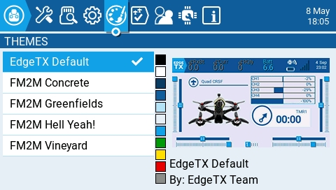 The Theme screen allows you to apply different colored themes to your radio. By default, the EdgeTX SD card comes with the themes shown above. Long pressing on a selected theme will give you the following options: