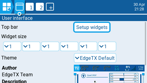 Selecting the setup widgets button will display the main view or top bar with the widget cells outlined in a hashed line.  You can assign a widget to a cell by selecting the cell and then the widget you want to assign to it from the drop-down menu. After selecting the widget, it will then open the configuration options for the widget for further configuration. Widget descriptions and configuration options for widgets included with EdgeTX are below.