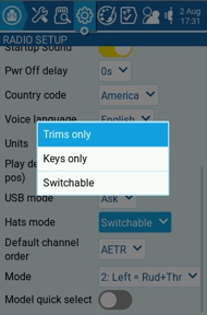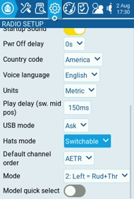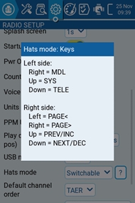 In the radio setup screen, you can configure the Hats Mode with one of the following options: