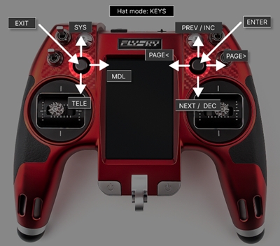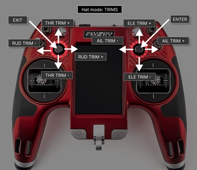 On the NV14 and EL18 radios, it is possible to navigate the menu options using the Trim hat switches.