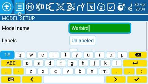 To allow for the easy entry of text and numbers, EdgeTX uses virtual text and number keyboards that can be interacted by either the touchscreen or roller. Additionally, there are shortcut keys that are mapped to the hardware buttons as described below: