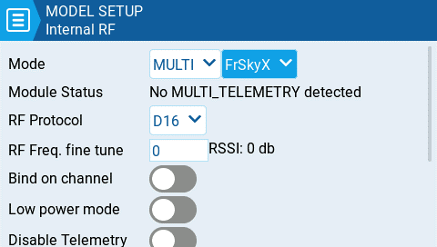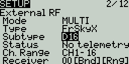 One the Student radio, configure either the Internal RF or External RF (which ever module will be used) to communicate to the Instructor radio. If using a multi-protocol module it should be set to ***Multi, FRSkyX*** and RF Protocol: ***D16***. Configure the receiver number to the same number configured in the step above.