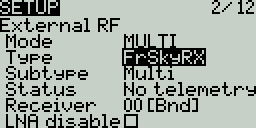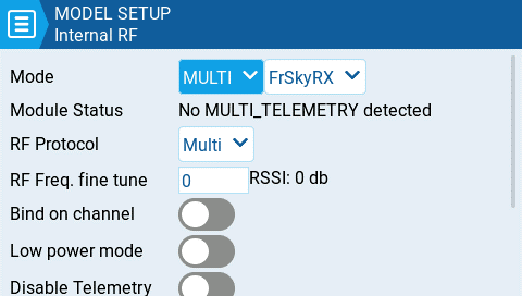 On the Instructor radio, configure the **Internal RF** and **External RF** sections in **Model Setup**. The RF Module's mode that will communicate with the Student radio should be set to ***Multi, FRSkyRX*** and RF Protocol: ***Multi***. Also, configure a receiver number. Both the Instructor and Student radios need to use this same receiver number. The other RX module should be configured to communicate with the model.