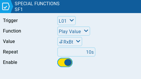 **Step 2:** Create a [Special Function](https://manual.edgetx.org/color-radios/model-settings/special-functions) that announces the battery value once the logical switch is activated.
