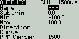 The **Outputs** screen is where final adjustments to the control data are made (including subtrims, curves, endpoint, and center values) before finally sending the control data to the RF module. This is where the channel center, limits (to prevent servo binding) and output direction are set.&#x20;