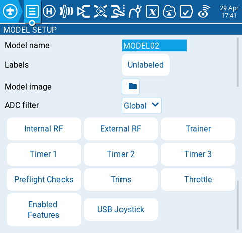 The Model Settings screen contains all the options to configure your model. Across the top of the page you will see icons that will take you to different pages of model settings when selected. The default screen for model settings is theModel Setup screen.