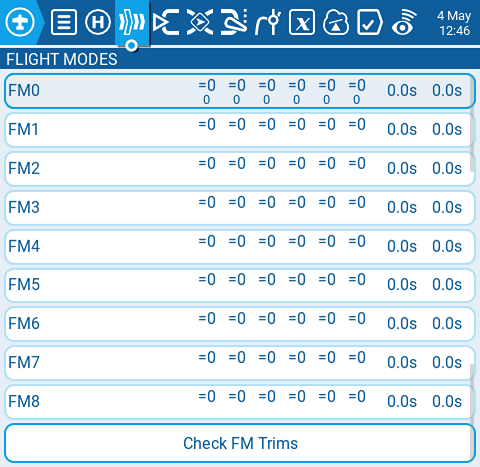 **Check FM Trims:** When the check FM trims button is pressed, the trims for the current flight mode are temporarily disabled. This is used to test the impact of the current flight mode’s trims on the outputs.