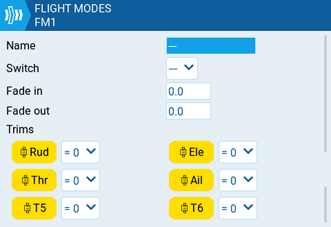 **Name:** The custom name for the flight mode. If configured, this name will be shown on the lower center position of the main screen between the trims.