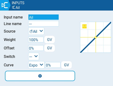 The **Inputs** screen of Model Settings is where you map your physical radio controls (for example: sticks, sliders, and pots) to a software input to be used by the radio. After the control has been mapped it is then possible to apply modifiers to the inputs such as a weight, offset or curve which will then be applied anywhere that input is used. Although it is possible to also assign switches as inputs, it is normally not needed as switch outputs seldomly need to be modified by a weight, offset or curve. By default, EdgeTX will automatically map your contoller sticks to Aileron, Elevator, Throttle, Rudder based on the default channel order defined in [Radio Setup.](https://manual.edgetx.org/v2.10/color-radios/radio-settings/radio-setup)
