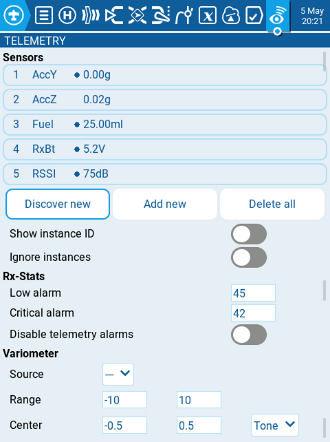 Telemetry is data received from the model to the radio from various sensors. These sensors may be in included in the radio receiver or flight controller, or may be separate sensors, such as GPS, variometer, or magnetometer. Telemetry data that is received can be displayed by EdgeTX in widgets, configured in alarms or audio call-outs.