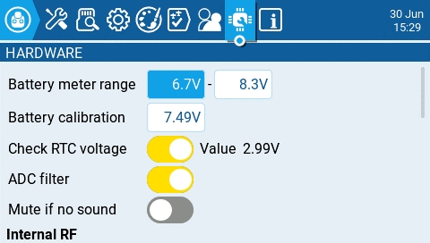 Battery meter range - Sets the maximum and minimum voltage for the battery meter. This should be set based on the type of battery you are using.
