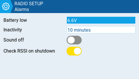 An "alarms disabled" visual warning is displayed when the transmitter is turned on if the sound mode is set to quiet.