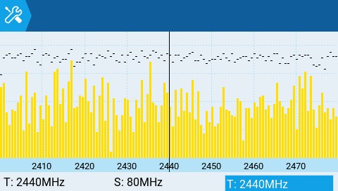 T: Frequency at the center of the plot (fixed at 2440MHz) S: Bandwidth of the plot (fixed at 80MHz) T: Position of the cursor (vertical line)