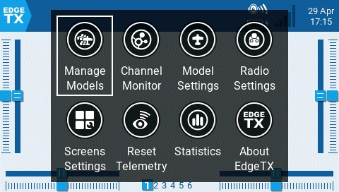 Touch the EdgeTX icon in the upper left corner of the screen to open the main navigation menu. Touch the desired menu option to select it.