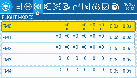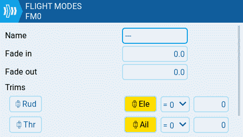 **Step 1:** Disable the trims for rudder and throttle which are not needed. Then we can reuse them for other functionality. Enter the model menu and navigate to the F[light Modes](https://manual.edgetx.org/v2.10/color-radios/model-settings/flight-modes) page. Edit **FM0** and disable the Throttle and Rudder trims. The yellow highlight color will be gone when the trims are disabled.