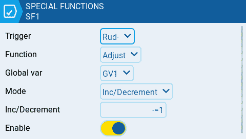 **Step 3:** We will now create 2 [Special Functions](https://manual.edgetx.org/v2.10/color-radios/model-settings/special-functions) to adjust the **GV1** value we created in the previous step. Navigate to the [Special Functions](https://manual.edgetx.org/v2.10/color-radios/model-settings/special-functions) page and create a new function **SF1** for decreasing **GV1**