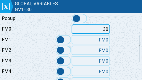 **Step 2:** Now we navigate to the [Global Variables](https://manual.edgetx.org/v2.10/color-radios/model-settings/global-variables) page and set a default value of 30 for **GV1** in **FM0**