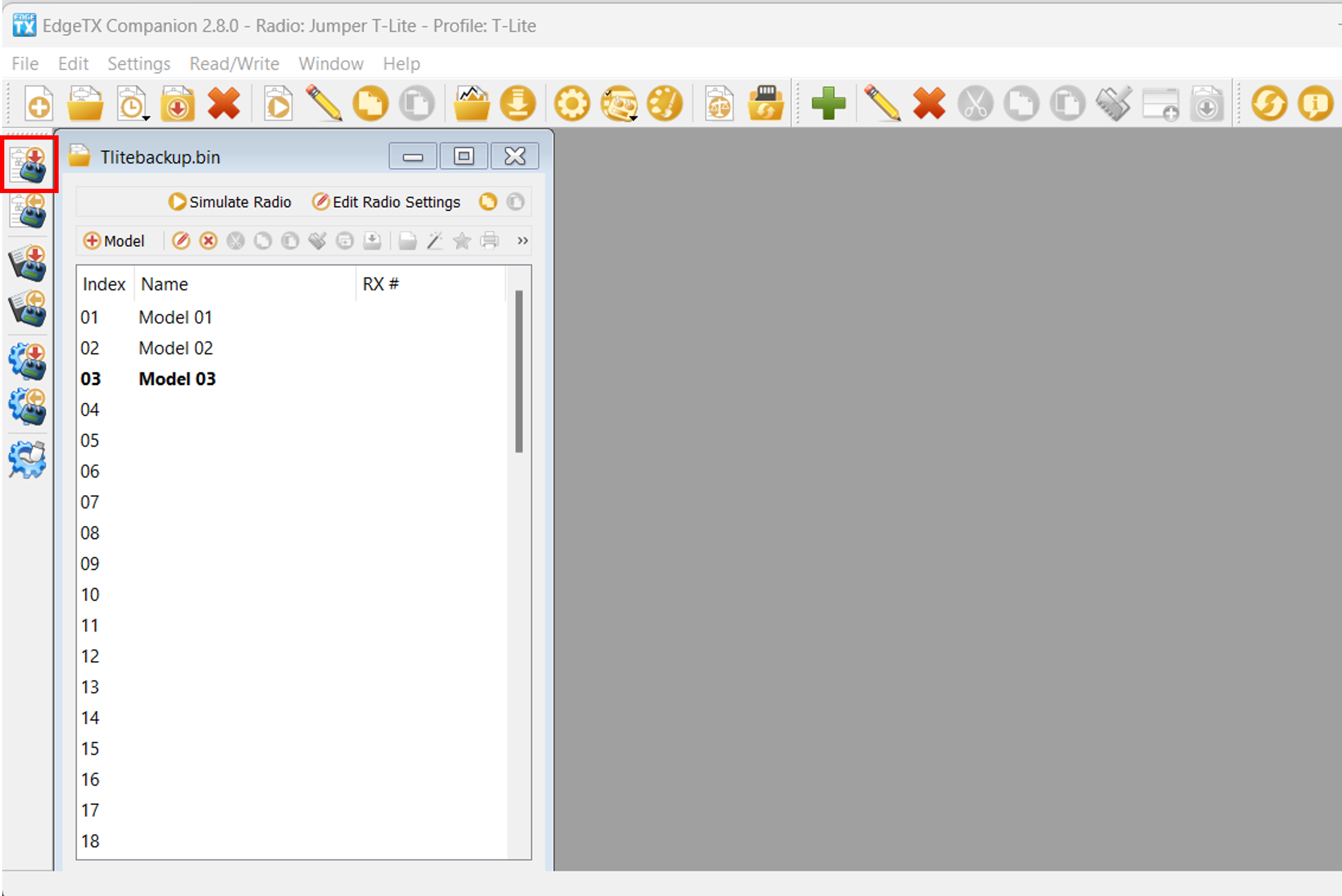 Open EdgeTX Companion. If you have not already done so, create a radio profile for your radio and make sure that it is selected as active.