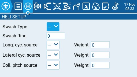 The Heli Setup page in Model Settings is an optional page that is available on custom-compiled versions of EdgeTX. The heli setup page is often used for collective pitch mixing (CCPM) used in flybared helicopters where the receiver directly controls the swashplate servos. Most flybarless helicopters do not need to configure this page. The outputs of the CCPM mixer are CYC1, CYC2, and CYC3, which need to be assigned to an output channel on the Mixes screen.